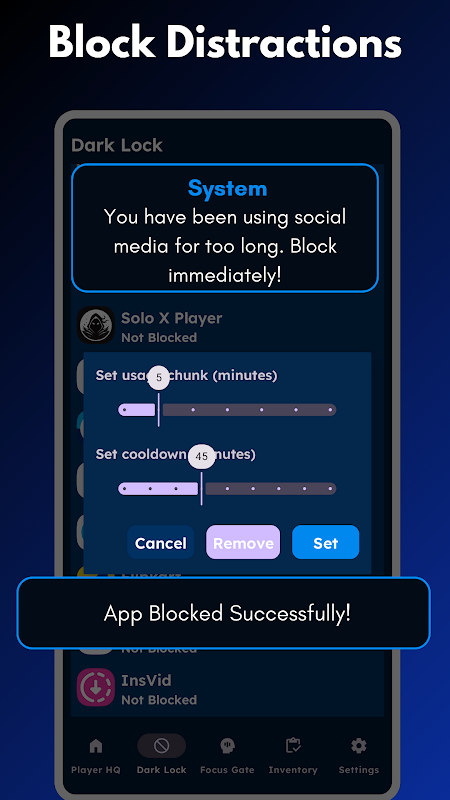 • Biến sự tập trung của bạn thành trò chơi bằng tính năng chặn ứng dụng mạnh mẽ giúp tránh bị phân tâm.