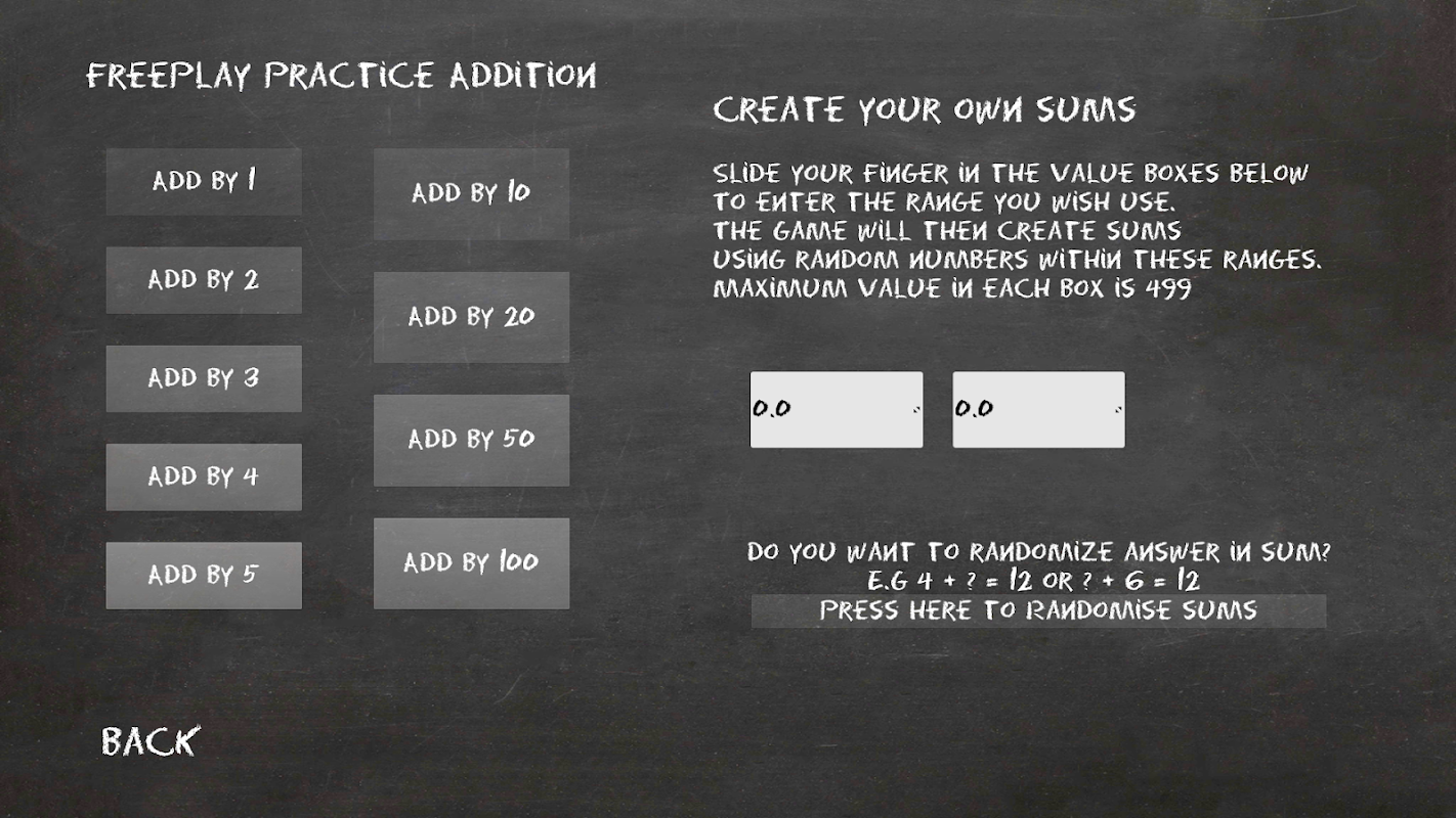 In freeplay you can choose the type of sums you want to try with no time limit or lives. You can work through all the tables again this time all randomised. In addition and subtraction mode you can create your own sums by entering your own amounts, so you can make the sums as easy or hard as you need. The bigger numbers will really train your brain!