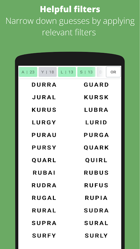 Lọc các dự đoán bằng cách chọn các chữ cái chưa được thử và tinh chỉnh bộ lọc bằng các toán tử AND/OR.