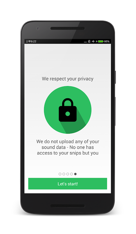 While SoundSnip is turned on, you are always ready to capture the recent past. It continuously buffers audio around in a one-minute-loop without saving it. But only when you tap the button the last minute of audio gets stored permanently on your phone.