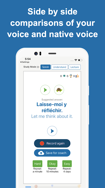 Là một nền tảng công nghệ, chúng tôi có sẵn như là một công cụ giáo dục 24/7. Speechling sử dụng sự lặp lại khoảng cách và các thuật toán tinh vi để cho phép người dùng của chúng tôi thực hành từ hàng ngàn câu với giọng nói thực sự của cả hai giới.