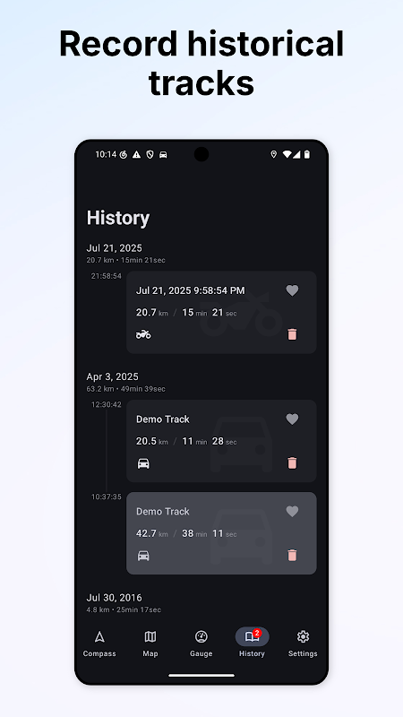 Tự động lưu các tuyến đường của bạn. Mỗi nhật ký chuyến đi bao gồm dữ liệu chi tiết và có thể xem lại hoặc chỉnh sửa sau.