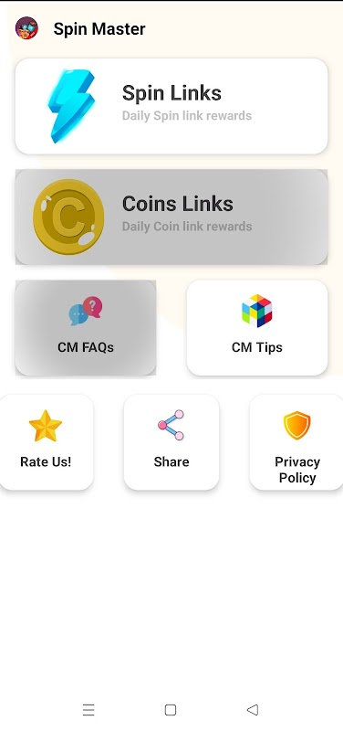 We use all spin, coin and other reward links from available public domain such as Official Facebook, Twitter pages of CM Game Spin master, We don't claim rights on any content in our Spin Link app. We always respect the rights and content of owner. Please note that this application is NOT a means of circumventing game mechanics and abides fully by respective laws, terms and conditions of Google play.