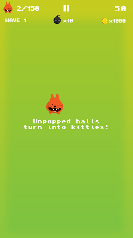Swipe to split a kit, then tap to pop. Unpopped balls turn back into kitties, try and clear the screen as more kitties fire on.