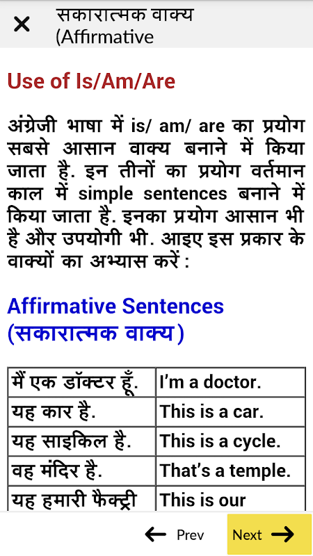 • This App will provide you more than 50+ Conversation that is part of your daily activity in Hindi and translated into English.