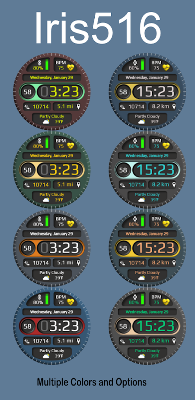 • Chỉ Wear OS: Mặt đồng hồ Iris516 được thiết kế dành riêng cho thiết bị Wear OS.