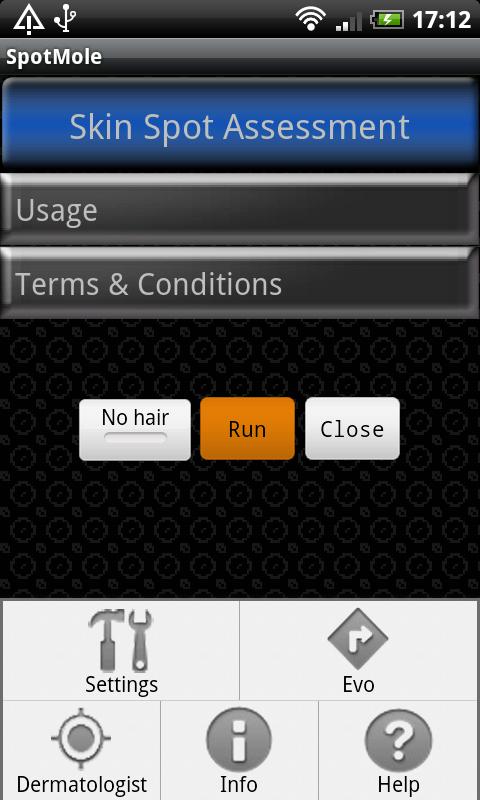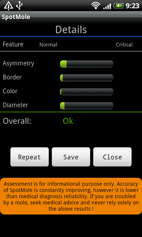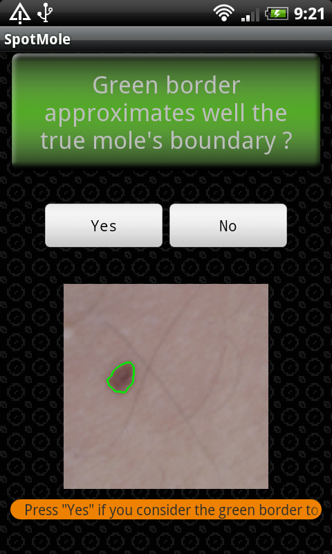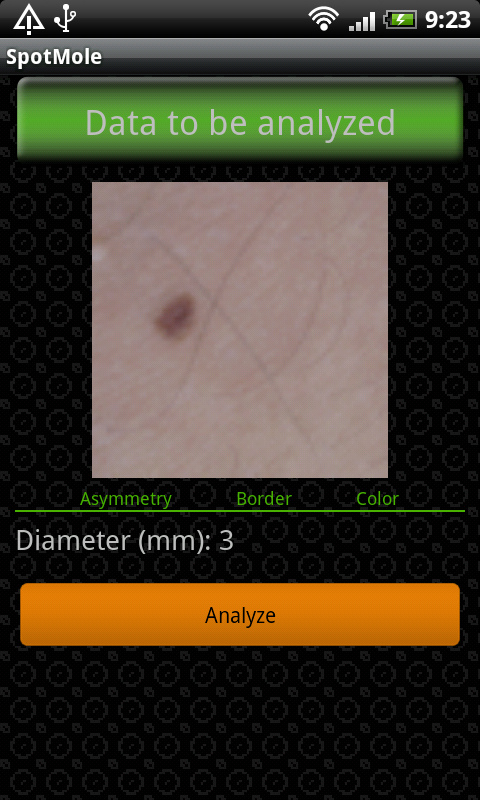 Using SpotMole you first have to take a close-up and well centered snapshot of a skin spot or mole and next run an analysis. SpotMole automatic assessment software uses standard visual analysis proceedures to check spots on the skin. The features extracted are common in dermatology and widely employed in visual inspection of the skin spots. These are Asymmetry, Border, Color, Diameter and Evolution of the mole (ABCDE).