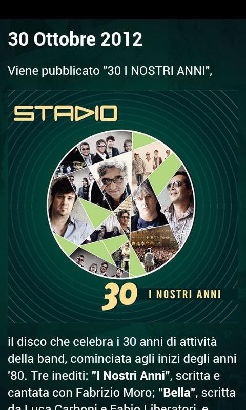 Un'App gratuita completamente dedicata agli STADIO - la band emiliana di Gaetano Curreri, Giovanni Pezzoli, Roberto Drovandi e Andrea Fornili - aggiornata in tempo reale, realizzata in occasione della festa per i 30 anni di attività, dove troverete foto e video inediti, tutte le news e le informazioni sulla discografia, sul tour, sui links più interessanti, e una carrellata di ospiti, amici e colleghi, dell'unica band che riesce a coniugare il "pop-rock" con la grande musica italiana d'autore.
