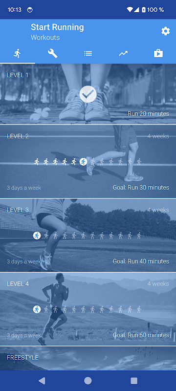 Mỗi cấp độ được thiết kế để kéo dài 4 tuần, với 3 buổi tập luyện được lên lịch mỗi tuần để giúp bạn cải thiện dần dần.
