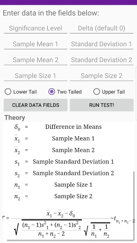 Chứa chín thử nghiệm khác nhau bao gồm các bài kiểm tra một và hai lựa chọn mẫu cũng như một đuôi và hai đuôi cho mỗi tùy chọn. Kiểm định giả thuyết Calculator không chỉ cung cấp các giải pháp, nhưng cũng chứa lý thuyết thống kê cho mỗi bài kiểm tra để hỗ trợ trong việc tìm hiểu.