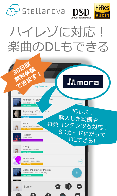 "Trình phát Hi-Res không dây ~ Stellanova ~" là một ứng dụng trình phát nhạc hỗ trợ nhiều loại nhạc khác nhau như Hi-Res, Audio CD, AAC, MP3, v.v.