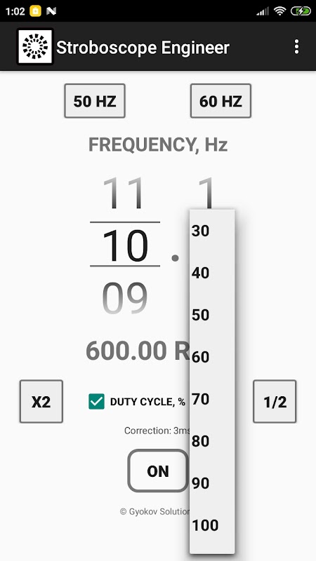 - tùy chọn bạn có thể hiệu chỉnh ứng dụng bằng cách bắt đầu hiệu chỉnh từ MENU - Hiệu chỉnh. Tốt nhất là nên hiệu chỉnh khi tần số thay đổi. Bạn cũng có thể đặt thời gian chỉnh sửa theo cách thủ công trong Cài đặt.