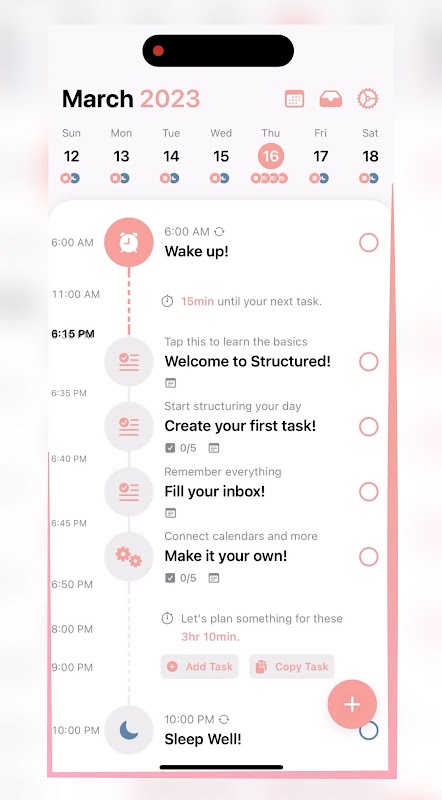 Công cụ lập kế hoạch hàng ngày có cấu trúc cũng cung cấp lịch tích hợp cho phép người dùng xem lịch trình và nhiệm vụ của họ trong một ngày, tuần hoặc tháng nhất định. Người dùng có thể chuyển đổi giữa các chế độ xem khác nhau và dễ dàng điều hướng qua lịch trình của họ. Lịch cũng tích hợp với lịch iOS, cho phép người dùng nhập các sự kiện và cuộc hẹn từ các nguồn khác.