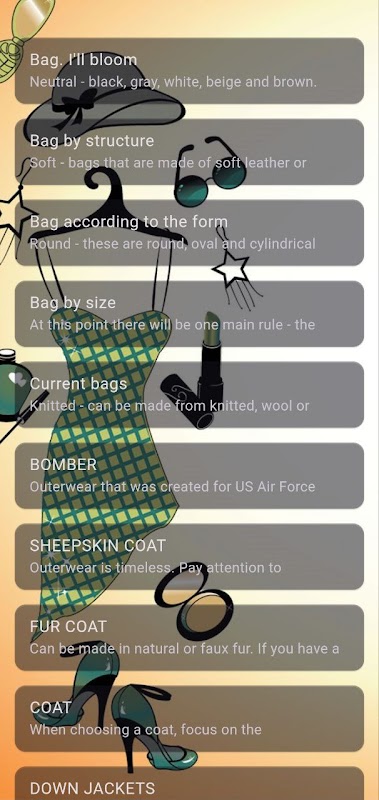 Việc lựa chọn một nhóm phụ kiện mà không có sự trợ giúp của nhà tạo mẫu luôn đặt ra những thắc mắc và nghi ngờ. Trong ứng dụng này, bạn sẽ tìm thấy thông tin từng bước giúp bạn quyết định lựa chọn túi và áo khoác ngoài cho bất kỳ bộ đồ nào.