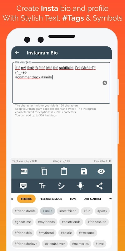 Viết tiểu sử của bạn và biến nó thành một bố cục phong cách với các phông chữ và biểu tượng hợp thời trang. Thay đổi kích thước, sao chép, lưu, chọn giữa các văn bản xem trước khác nhau .. Thể hiện sự sáng tạo và phong cách của bạn với các tính năng chỉnh sửa mạnh mẽ của chúng tôi. Khi bạn nhập văn bản, nó sẽ chuyển văn bản nhàm chán bình thường của bạn thành các phông chữ sành điệu hoặc các kiểu văn bản lạ mắt.