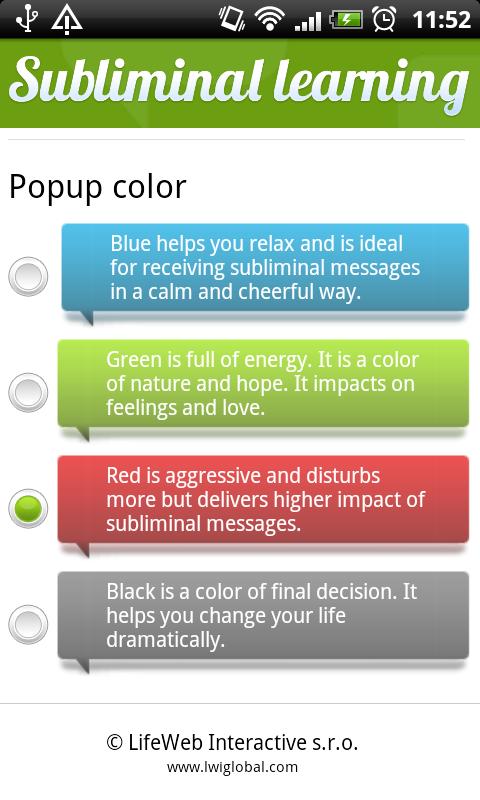 Download and install the application. You can choose desired languages and topics. The application will be running in the background and from time to time it will show up a short subliminal message with a high impact on your mind. You may notice it or not but your mind will. The message helps you learn vocabularies.