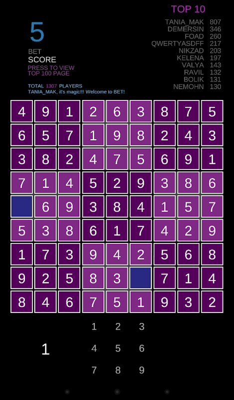 Sudoku Arcade with The Table of Glory (Leaderboard and Score).