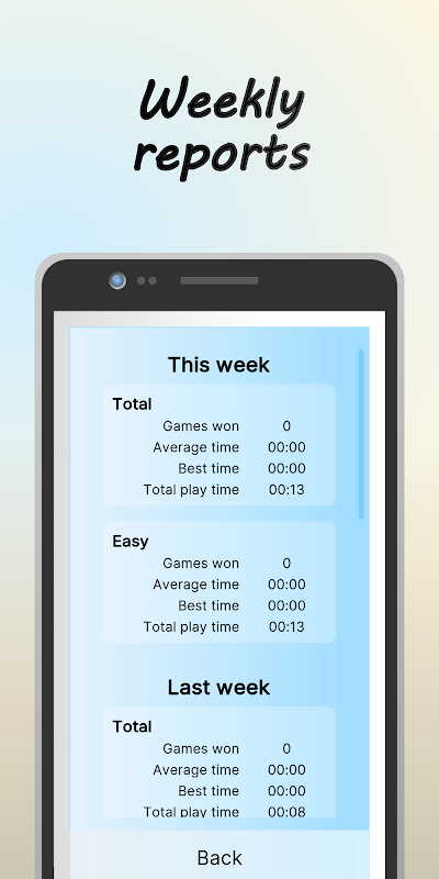 Trò chơi hiển thị cho bạn báo cáo về thời gian trung bình và tốt nhất của bạn tùy thuộc vào mức độ khó trong tuần trước, 4 tuần trước và trong toàn bộ thời gian.
