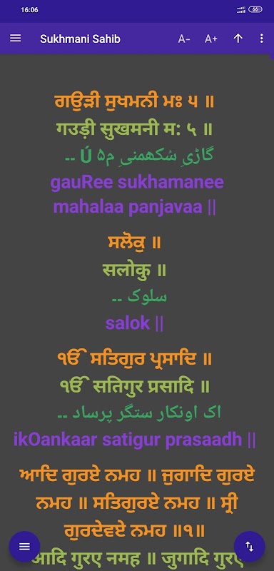 Con đường Sukhmani Sahib trong Gurmukhi, Hindi, Urdu, tiếng Anh với ý nghĩa dịch thuật.
