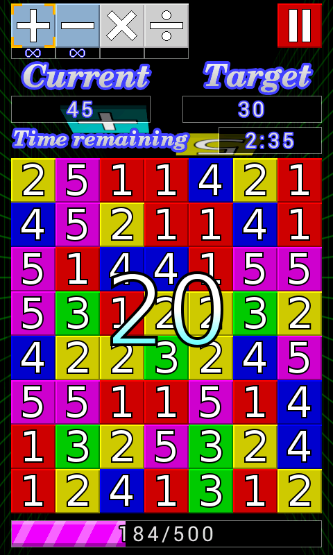 Summation is a match 3 game, but with a twist. To complete each level, you must reach a target number. This is achieved by adding, subtracting, multiplying and dividing the tiles on the board by matching 3 or more of them.