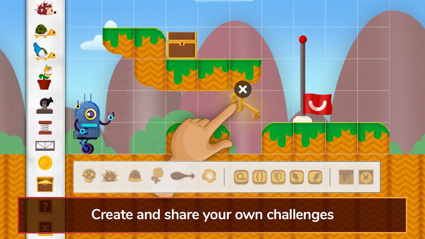 Và cuối cùng... TẠO CẤP ĐỘ CỦA RIÊNG BẠN! Trở thành một lập trình viên chuyên nghiệp và chia sẻ những sáng tạo của riêng bạn. Phụ huynh và giáo viên cũng có thể tạo ra những thử thách cho trẻ em hoặc học sinh.