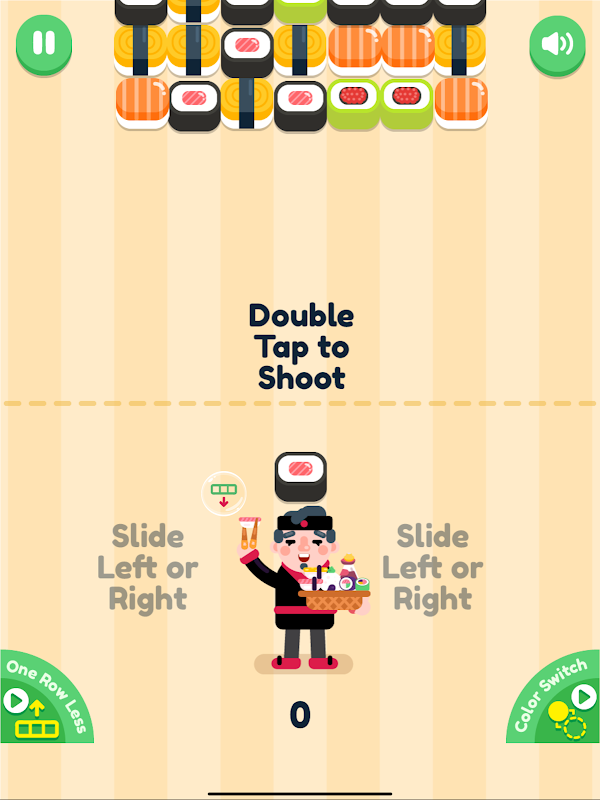 Trượt từ trái sang phải để bắn sushi lên, khi cuộn sushi xuống bạn phải chọn đúng màu sushi để quay.