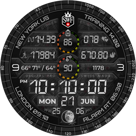 Dòng SWF Cipher Digital PRO gây ấn tượng với nền đồng hồ hoạt hình chi tiết và cho phép bạn tạo ra hàng nghìn sự kết hợp khác nhau bằng cách tự do kết hợp đường viền, vòng bezel, mặt kính, chữ số, kim và màu sắc. Dòng PRO cho phép bạn định cấu hình tối đa 5 biến chứng và 3 ứng dụng tùy chỉnh trên mặt đồng hồ của mình.