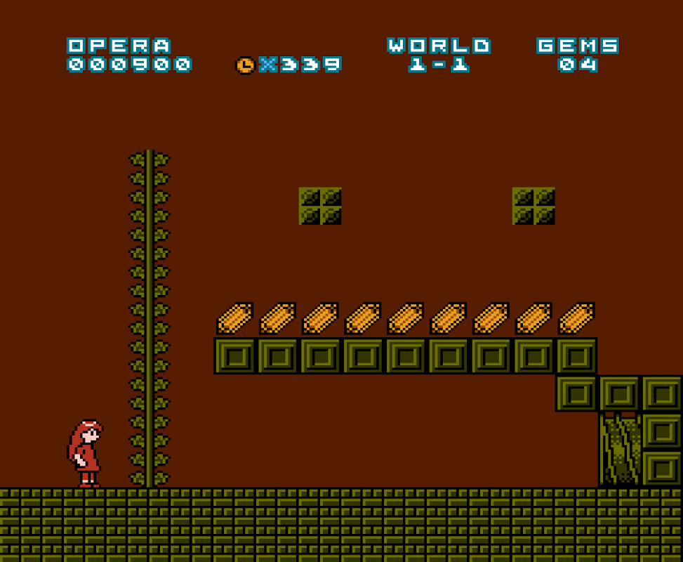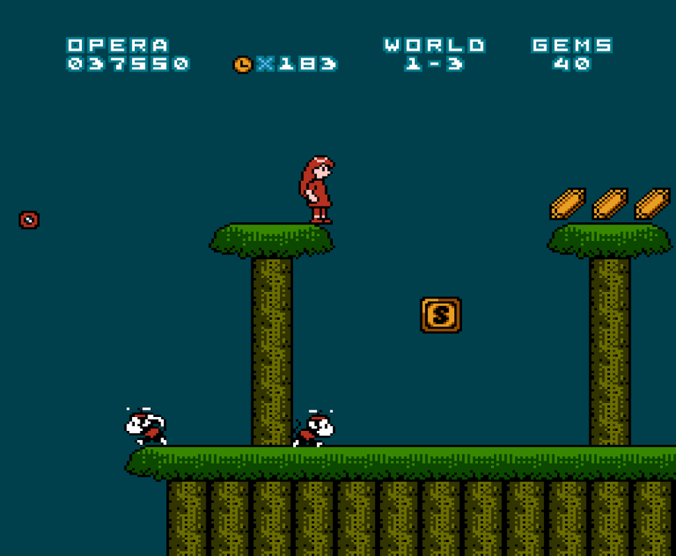 The game world features gems scattered around for Opera to collect and special bricks marked with a “S”, which when hit from below by Opera may reveal more gems or a special item. Other "secret", often invisible, bricks may contain more gems or rare items. If the player gains a heart, Opera will turn purple color. If Opera gets hit in purple color, then instead of dying she turns back to red Opera.