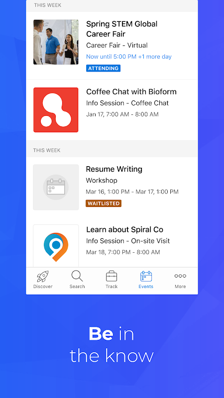 Nếu trường của bạn sử dụng Symplicity Career Services Manager, ứng dụng di động này là một bạn đồng hành cần thiết để trang web dịch vụ nghề nghiệp của bạn. Với ứng dụng này, bạn có thể nhận được các khuyến nghị việc làm và thực tập dựa trên lợi ích và hành vi của mình; nhanh chóng tìm kiếm, đánh dấu yêu thích và áp dụng đối với công việc và thực tập; lên lịch phỏng vấn trong khuôn viên trường; tìm và tham dự các sự kiện tuyển dụng; có sơ yếu lý lịch của bạn xem xét; lên lịch các cuộc hẹn tư vấn và nhiều hơn nữa. Sẵn có của các tính năng phụ thuộc vào sự tham gia và cấu hình của trường.