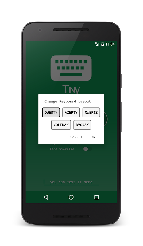 Bạn có thể chọn giữa 8 MÀU SẮC hoặc đặt KÍCH THƯỚC bàn phím của riêng bạn. Tiny Text cũng hỗ trợ các bố cục bàn phím khác nhau: QWERTY, AZERTY, QWERTZ, DVORAK và Colemak.