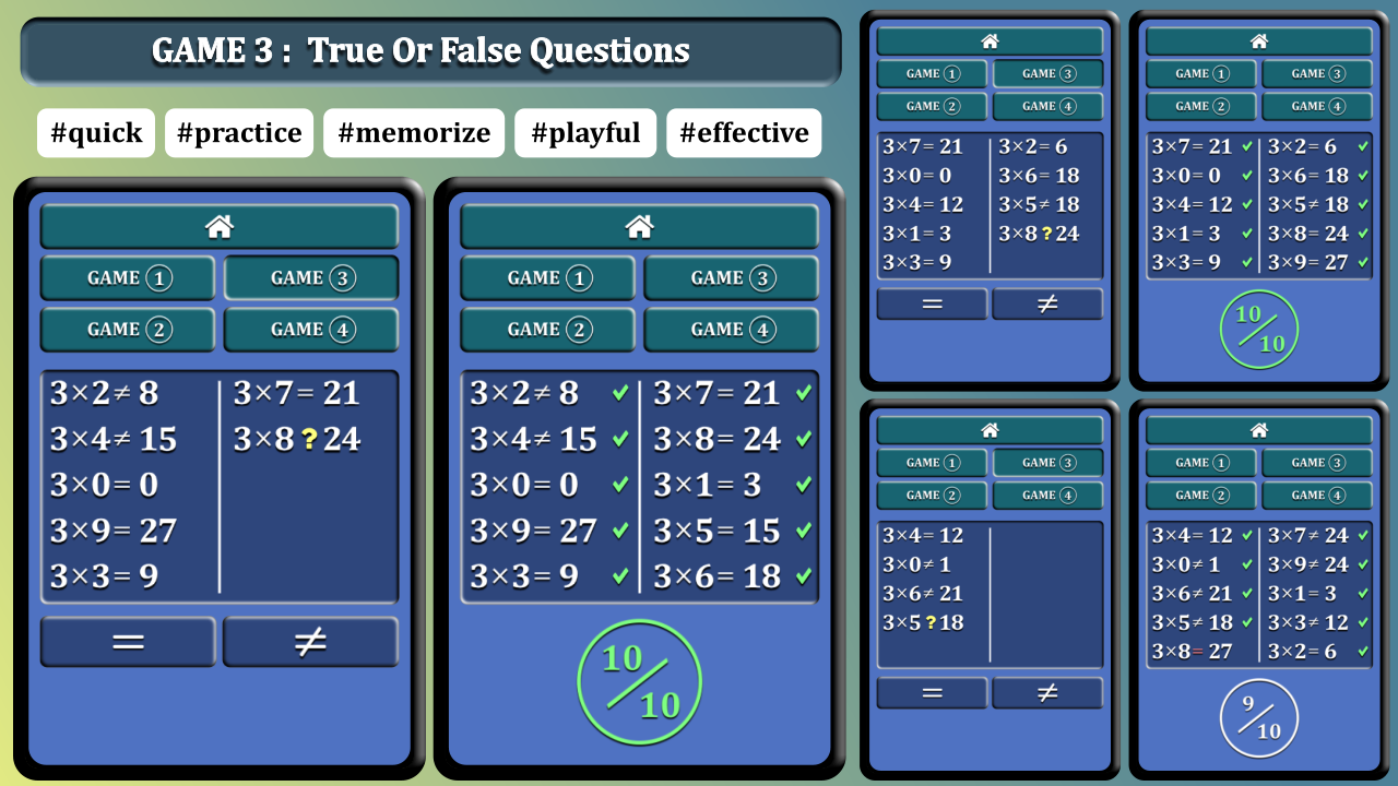 Ứng dụng Table3x miễn phí nhưng rất hiệu quả để làm việc và ghi nhớ bảng cửu chương với 3. Thiết kế mới, trò chơi mới, hình ảnh động mới. Hiện nay, ứng dụng Table3x cung cấp 4 trò chơi: