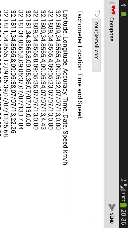 Vĩ độ, kinh độ, độ chính xác, thời gian, ngày, tốc độ km / h.