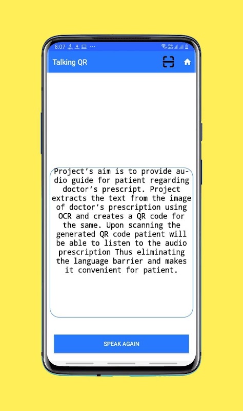 Mục đích của Dự án là cung cấp hướng dẫn âm thanh cho bệnh nhân về đơn thuốc của bác sĩ. Project trích xuất văn bản từ hình ảnh của bác sĩ theo toa bằng cách sử dụng OCR và tạo mã QR cho cùng. Khi quét mã QR được tạo, bệnh nhân sẽ có thể nghe toa thuốc âm thanh Do đó loại bỏ rào cản ngôn ngữ và tạo thuận tiện cho bệnh nhân.
