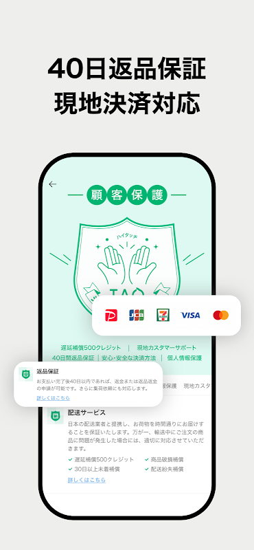 TAO hỗ trợ thanh toán PayPay. Chúng tôi đã thực hiện các biện pháp bảo mật mới nhất để bạn có thể thanh toán an toàn thông qua PayPay. Ngoài ra, lịch sử giao dịch được quản lý hợp lý nên khách hàng PayPay có thể yên tâm sử dụng dịch vụ.