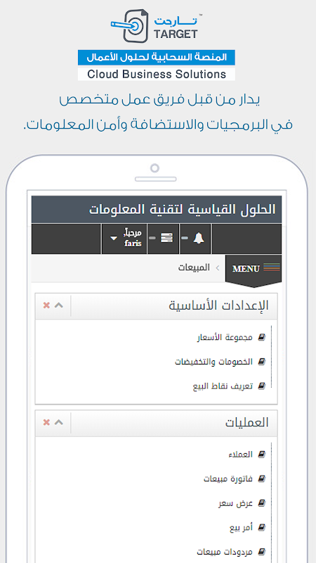 Target ERP Target ERP là nền tảng điện toán đám mây giải pháp kinh doanh đầu tiên cho các doanh nghiệp và các doanh nghiệp nhỏ và vừa chứa nhiều hơn một đám mây dịch vụ bao gồm cả các tài khoản, bán hàng, mua sắm, hàng tồn kho, nguồn nhân lực và hệ thống quản lý dự án được phát triển bởi các giải pháp tiêu chuẩn công ty CNTT, chuyên sản xuất và phát triển hệ thống hoạch định nguồn lực chính phủ và các tổ chức tư nhân. Nó hoạt động trong các giải pháp tiêu chuẩn của các chuyên gia ưu tú với kinh nghiệm tốt nhất và thiết thực nhất thế giới trong lĩnh vực công nghệ thông tin.
