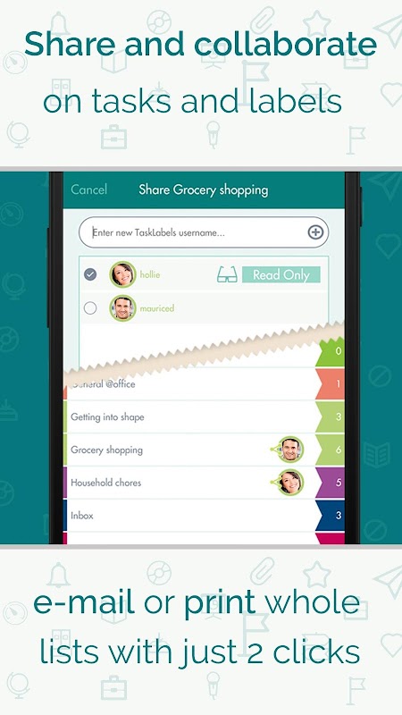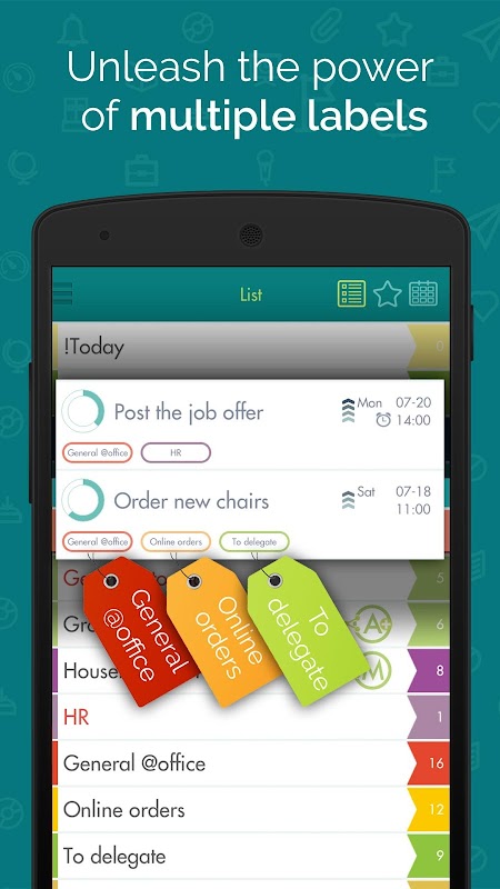 TaskLabels is optimized to help you get things done! Use it for daily to-dos, as a weekly planner, for errands, household chores, grocery lists, checklists, travel lists, shopping lists, notes, as a calendar, and for prioritizing your life! Easily set reminders, sort tasks, set priorities, dictate notes, and group tasks. Effortlessly collaborate with friends and coworkers by sharing lists and managing collaborators. And sync your to-do list data across other Android devices, Apple products (iPhone & iPad), online (PC or Mac), and to the cloud. Download the versatile TaskLabels app today & see how it can boost your productivity!