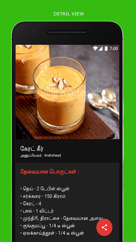 - Share Tamil/Indian Samayal Kurippu (Recipes) you like to friends via One Click to Whatsapp/Email/Messaging and your friends can directly open in our app