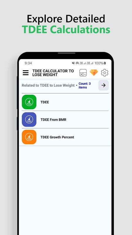 ► Tính toán TDEE chính xác: Dễ dàng tính toán Tổng chi tiêu năng lượng hàng ngày dựa trên độ tuổi, cân nặng, chiều cao, giới tính và mức độ hoạt động để hiểu nhu cầu calo của bạn.