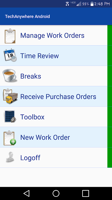 Thông qua giao diện độc đáo, phần mềm TechAnywhere® sử dụng nhiều thiết bị không dây khác nhau để cho phép các kỹ thuật viên điền vào vé công việc, truy cập thiết bị và lịch sử vật liệu, tạo đơn đặt hàng và tạo đơn đặt hàng, chụp chữ ký, tích hợp GPS, quản lý tài liệu, in hóa đơn và nhiều hơn nữa .