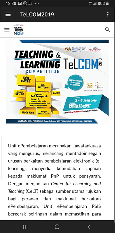 Unit ePembelajaran PSIS dengan kerjasama Unit Pembangunan Instruksional dan Multimedia akan mengadakan Teaching and Learning Competition (TeLCOM 2019). TeLCOM 2019 merupakan pertandingan berbentuk rekacipta bahan pengajaran & pembelajaran berinovasi yang dilaksanakan untuk memperkasakan inovasi bahan pengajaran & pembelajaran supaya mempunyai kualiti dan berimpak tinggi. TeLCOM 2019 ini terbuka kepada semua pelajar dan pensyarah Politeknik Sultan Idris Shah dari semua jabatan dalam menghasilkan dan mempersembahkan projek inovasi bahan pengajaran & pembelajaran terbaik untuk dipertandingkan.
