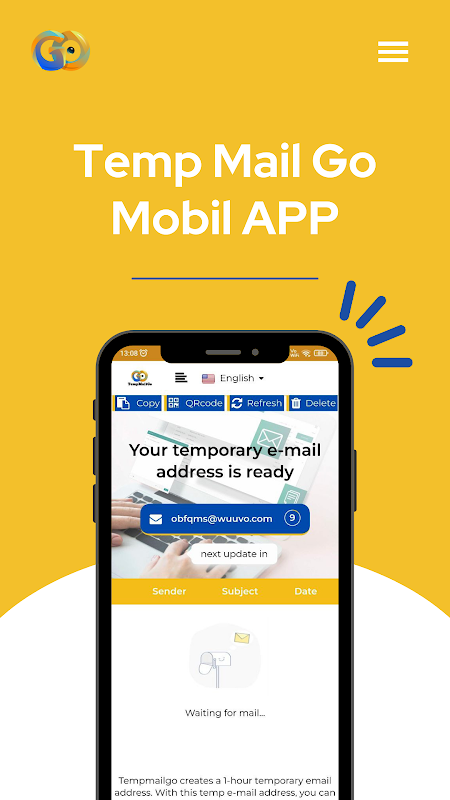 Tempmailgo tạo địa chỉ email tạm thời trong 1 giờ. Với địa chỉ e-mail tạm thời này, bạn có thể đăng ký vào các trang web, nền tảng xã hội như facebook, twitter, đọc e-mail gửi đến và kích hoạt tài khoản của mình. Đừng quên lấy liên kết được mã hóa từ phần mã QR để sử dụng lại địa chỉ e-mail dùng một lần sau này.