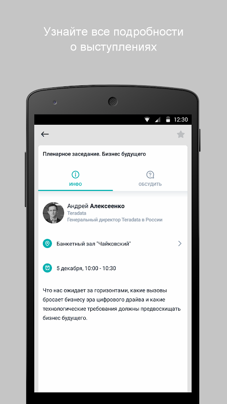 Следите за обновлением расписания в режиме реального времени, составляйте собственную программу и получайте оповещения о самых интересных событиях форума. Кроме того, с помощью приложения вы можете задать вопросы докладчику и оценить доклад, а также принять участие в опросе!