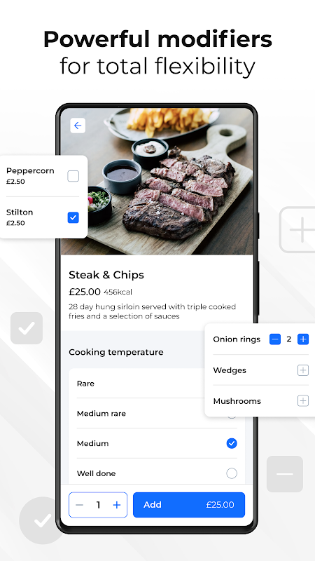 Nhận đơn đặt hàng trong một vài thao tác và gửi chúng thẳng đến nhà bếp. Không còn lỗi trên các ghi chú viết nguệch ngoạc, hoặc chạy đi chạy lại cho đến hết. Hình ảnh mặt hàng giúp điều hướng dễ dàng hơn nhiều và các mặt hàng có thể được thêm vào đơn hàng chỉ bằng một cú nhấp chuột. Giao diện rõ ràng và trực quan khiến việc đào tạo nhân viên mới trở nên dễ dàng đến mức tối thiểu.