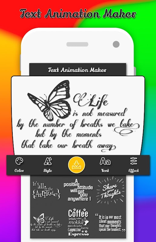 Background Text animation app where you can overlay colorful background with text animation. You can change the background color with color wheel easily. You can also change the text color with colorful wheel easily
