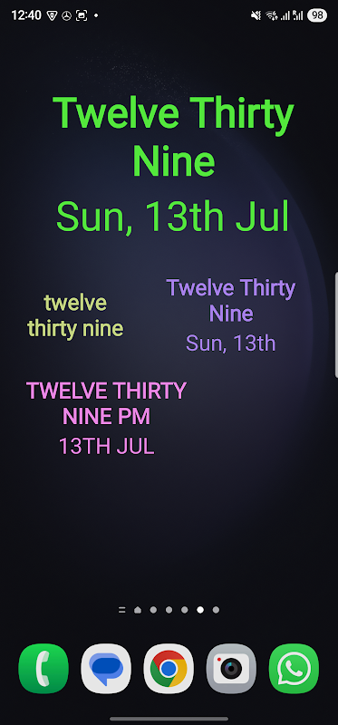 Tiện ích đơn giản hiển thị ngày và giờ hiện tại, với thời gian hiển thị dưới dạng chữ thay vì số. Có thể tùy chỉnh kích thước phông chữ và màu sắc, vì vậy bạn có thể sử dụng phông chữ lớn hơn nếu gặp khó khăn khi đọc chữ nhỏ trên đồng hồ Android mặc định.