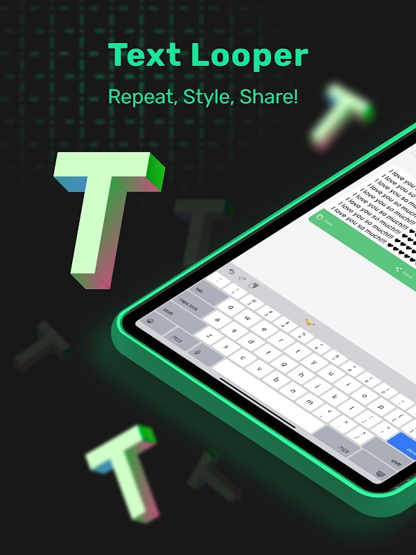 Vượt ra khỏi điều bình thường! Text Looper giúp bạn lặp lại văn bản của mình bao nhiêu lần tùy ý. Thử nghiệm với sự lặp lại để tạo ra các hiệu ứng hình ảnh lôi cuốn hoặc sử dụng nó để nhấn mạnh thông điệp của bạn. Các khả năng là vô tận, và quyết định là của bạn!