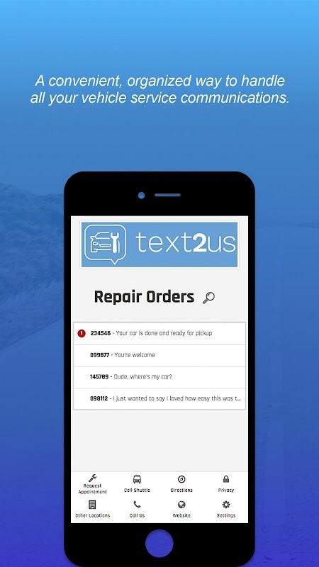 Tải về và sử dụng ứng dụng Text2Us trên điện thoại thông minh của bạn. Không bao giờ bỏ lỡ thông tin quan trọng từ Cố vấn dịch vụ của bạn. Đặt câu hỏi Dịch vụ Cố vấn của bạn hoặc cho phép để sửa chữa của bạn.