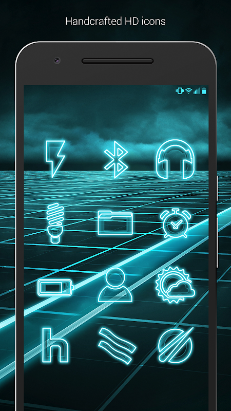 • Chứa hơn 2.500 biểu tượng tương lai khoa học viễn tưởng phát sáng màu xanh neon / teal với nhiều biến thể của các biểu tượng mặc định như điện thoại, danh bạ, máy ảnh, v.v.