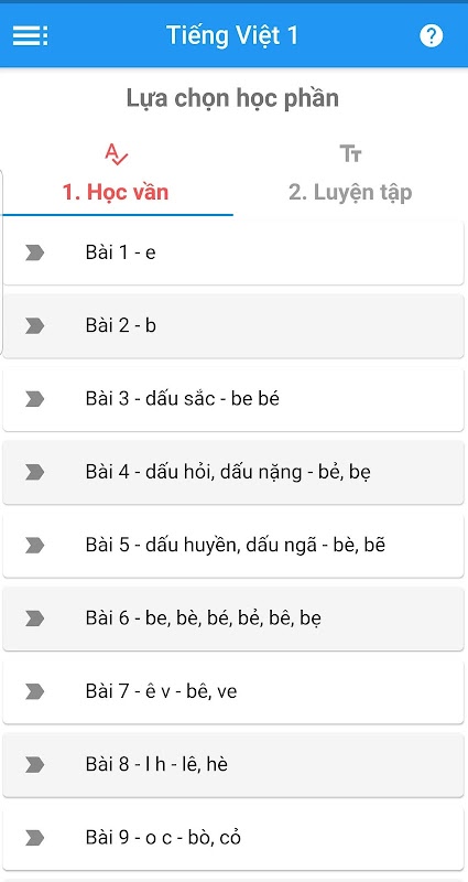 Ứng dụng Tiếng Việt 1 - tập 1+2 hỗ trợ các bé từ 5 đến 8 tuổi trong quá trình học đánh vần. Nội dung trong ứng dụng bám sát theo sách giáo khoa Tiếng Việt 1 của Nhà xuất bản giáo dục Việt Nam.