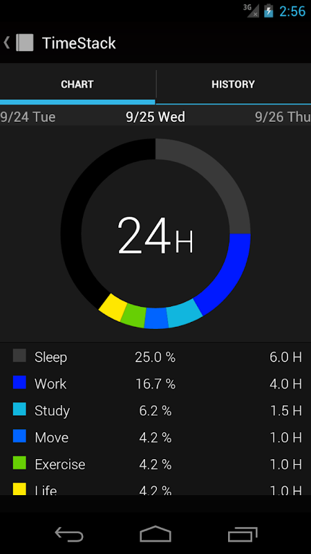 There are pie chart and bar chat for statistics, and there is a history view that list each day, week and month.